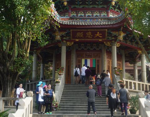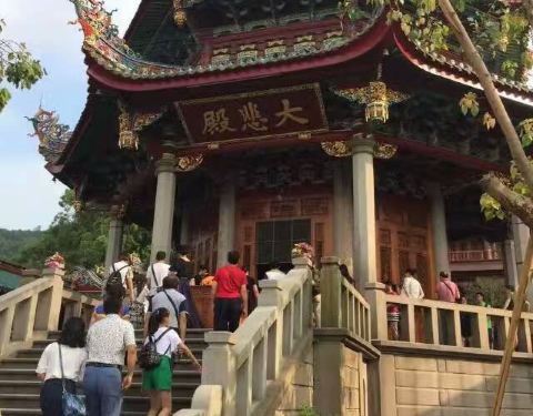大悲殿一座八角亭式建筑,坐落于南普陀寺内大雄宝殿之后,楼阁建在高台上,供奉着观音娘娘;香客络绎不绝,旅游团游客众多,祈祷“中华复兴”!