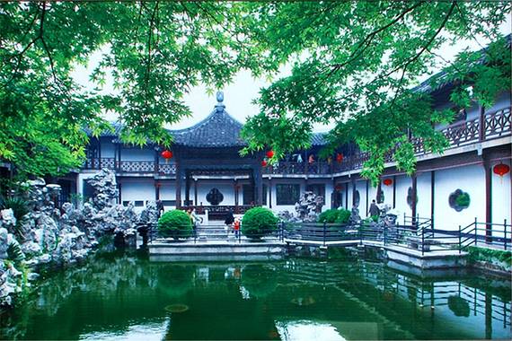 园林中遍植绿竹,假山叠石值得一看