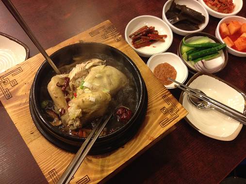 看过《大长今》的童鞋一定知道这道料理,夏季农历初伏的时候韩国人都会聚集在参鸡汤店里“以热治热”,夏天来釜山玩儿绝对不要错过集一整只鸡的精华于一体的蔘鸡汤。