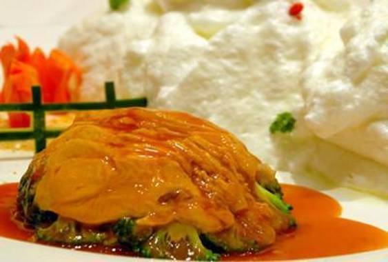 “雪山驼掌”以终年白雪皑皑的祁连山、广阔无垠的戈壁滩和沙漠之舟的骆驼群为背景,经过精心构思,以高超的烹饪技艺再现了河西走廊特有的壮丽景色。此菜雪山洁白,丝路弯弯;驼掌筋烂,肉酥可口,色泽淡黄,晶莹透亮,味道鲜美。驼掌全部是筋,其营养价值很高。