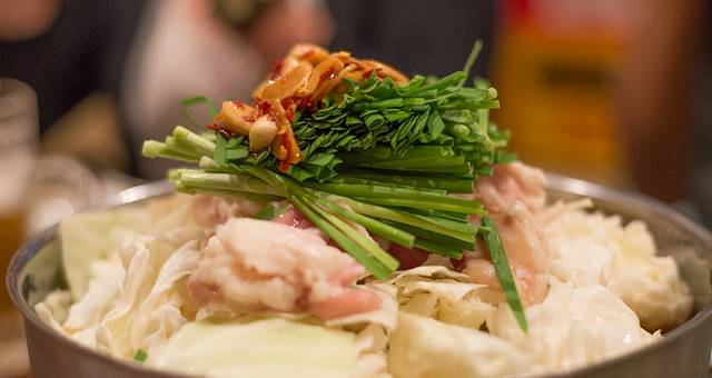 牛的小肠和大肠等内脏统称为[MOTSU],热量低,营养价值高,是很健康的食品。在福冈,用鲣鱼和海带炖煮的汤汁里加上酱油和酱料来调味,飘着大蒜味道的汤里放入[MOTSU],韭菜,包心菜,再加鹰爪(辣味)来煮透。
