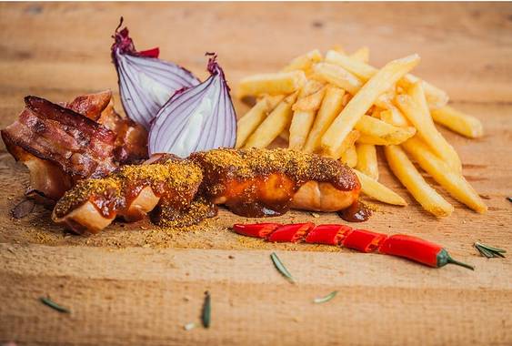 咖喱香肠是一种德国快餐,也是首都柏林的风行料理之一。根据德国咖哩香肠博物馆的估计,德国人每年大约吃掉八亿根咖哩香肠,如今的咖哩香肠既有街头售卖的“屌丝”吃法,也有“高大上”餐厅里供应的套餐,常见的搭配组合包括薯条或圆面包。咖喱香肠是烹煮再油煎的切块香肠浇上咖哩番茄酱,其调料一般是混入大量咖哩粉的番茄酱(Ketchup)或芥末酱(Senf),购买时需要告诉店家要哪种酱。