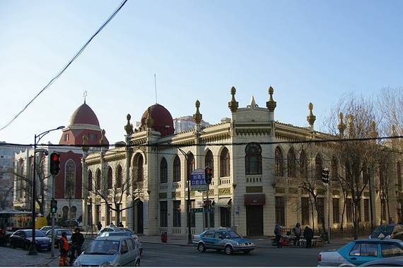 通江街是道里区的一条老街,与中央大街平行,一路通到松花江畔。街上有几栋犹太历史老建筑,一栋是经纬街口的的犹太新会堂,一栋是新会堂,即现在的卡兹旅舍;还有一栋是朝鲜族中学。这些犹太建筑多有着红色的圆顶,建筑上有着六芒星的明显标志。