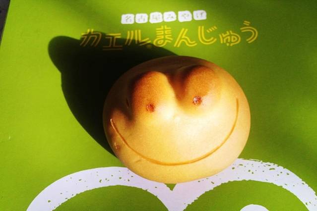 名古屋日本传统点心名店青柳总本家的标志是一只跳到柳树上的小青蛙,店铺便利用此形象做出了豆沙馅的小青蛙馒头。青蛙在日语里叫 “カエル”,读音与“回家”、“回归”相近,因此包含着希望旅人安全归家的意义。小青蛙豆沙馒头因其吉祥的寓意、可爱的外表和香甜的口味而深受喜爱,是名古屋人气伴手礼之一。