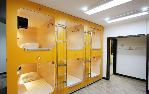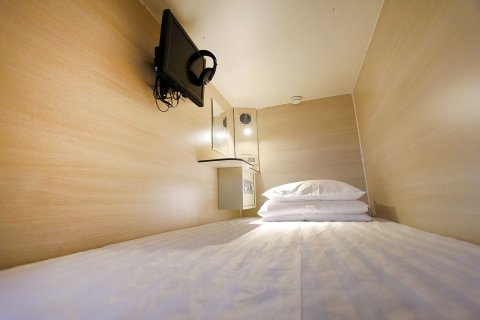 胶囊房内配有电视、化妆小桌以及小保险箱,胶囊房就是自己的独立小空间了!