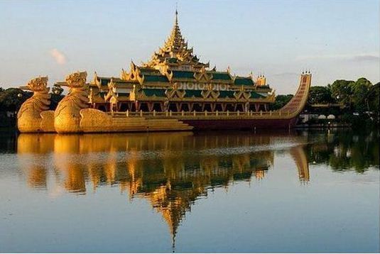 卡拉威宫位于景色秀丽的皇家湖上,是皇家湖上的一艘游船。曾经是古代缅甸皇帝御用的水上餐厅,造型为两只传说中的神鸟背驮一座宝塔,浮游在皇家湖上,象征吉祥、安乐。