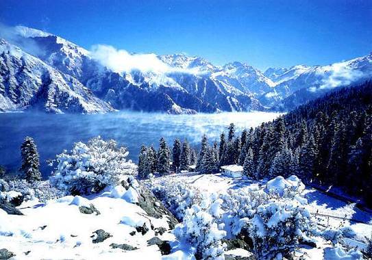 西白杨沟沟谷里,雪峰点点,群山峻峭,云杉挺拔,绿草如茵。