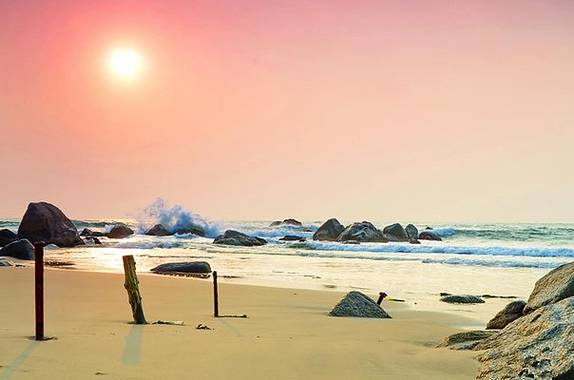 这里因香水岭流来的泉水注入海湾而得名,与万宁市的石梅湾相接,与分界洲岛遥遥相望。如今这里依然保持着原生态的海滨风光,踏入香水湾,首先映入眼帘的是青翠的椰林,再就是漫无尽头的银色沙滩,低处若毯,高处成丘。香水湾较为僻静,沿着海岸线走着,浪花声声声入耳。