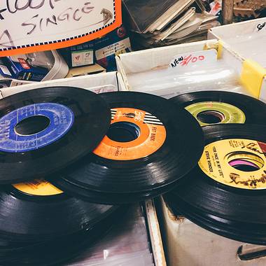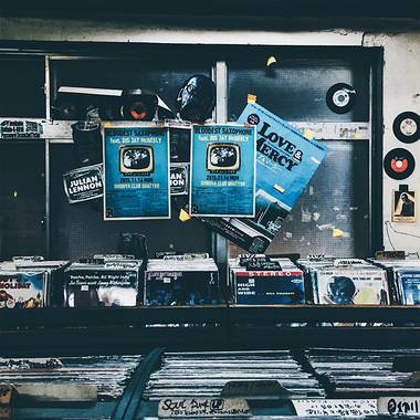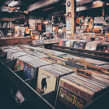 二楼堆满了黑胶唱片,在昏暗的灯下看起来旧旧的