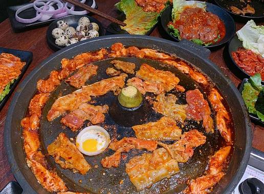 店内招牌五花肉、外加烤盘上的蛋液让人回味无穷