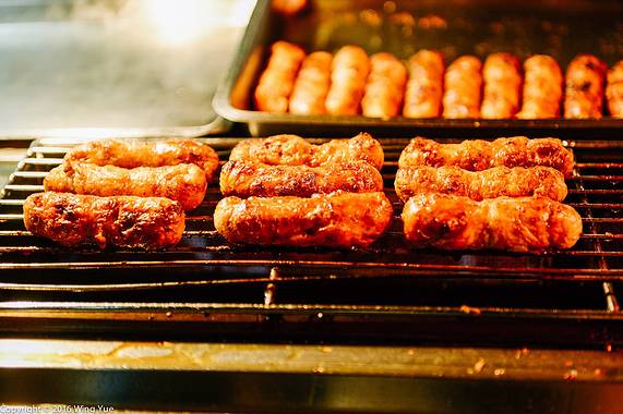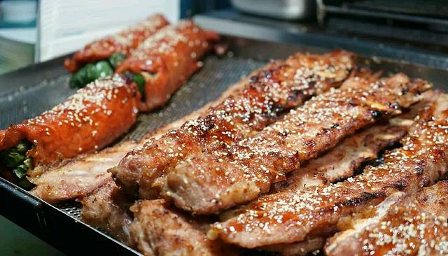 炸好的金黄色大鸡排,抹上独家特调酱料,再以木炭现烤约2-3分钟