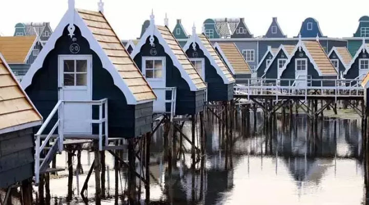 值得一提的是靠近码头的一片荷兰式的小木屋,恍如点缀在水面上的方形盒子,让岛上充满了异域风情。