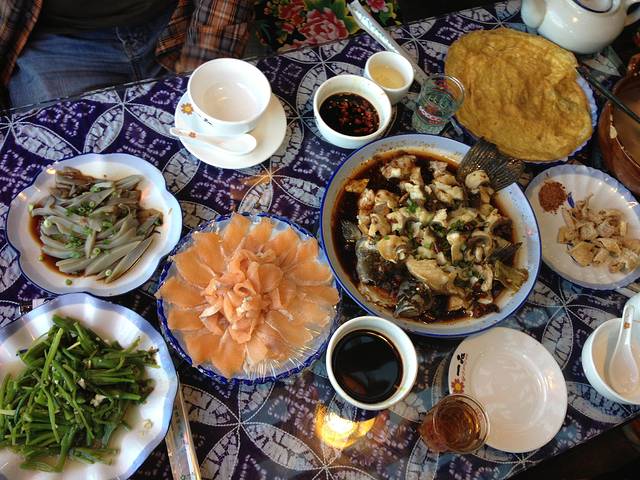 晚上回到束河古镇,这里和丽江不同的风格,没有丽江那么商业化,但是景色一点也不逊色。晚上住在古道人家客栈,晚饭在木子餐厅解决,有新鲜的三文鱼和老板家的招牌酸菜鱼,还有自酿的梅子酒,必须的尝尝,味道相当不错,有点小昂贵,三个人五百多块。在这里还有红谷的总店,晚上去了著名的樱花屋,驻唱唱歌很好听。
