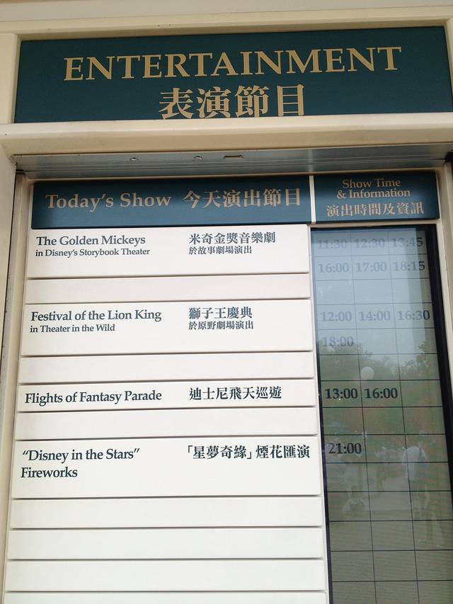 2.进入美国小镇后在右手边有今日表演的时间安排,可以拍照记下;因为每个项目的排队会耗掉你大半个钟头,知道所有表演的所有时间方便安排行程,一个不落看下。