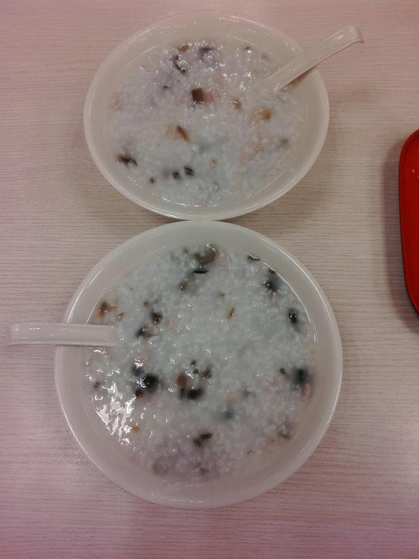 点了两碗皮蛋瘦肉粥和一份生煎