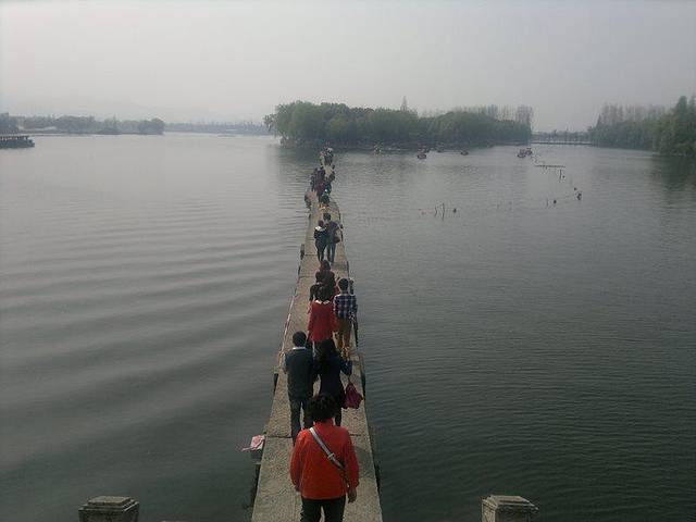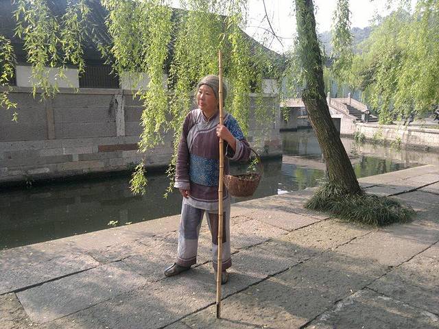 从鲁镇的一个入口进入,在一个双桥边上路遇了祥林嫂,最开始我没有反应过来,是边上的游客喊:“祥林嫂等下,拍照片要钱吗?”祥林嫂:“不要钱”,然后大家都一窝蜂的轮流上去跟祥林嫂拍照片,祥林嫂穿着破破的衣服,挎着小篮子,手里柱着一根竹竿拐杖。走到临河的一边,当游人走到她边上,对面相机举起的时候,祥林嫂很自然的拍了个造型,天哪,当时游客齐声震惊了,都说太像了,被人很多人争着合影,祥林嫂没有丝毫不高兴,而且还每个人合影她的动作造型都有些改变,我对鲁镇的感觉一下子就上来了。