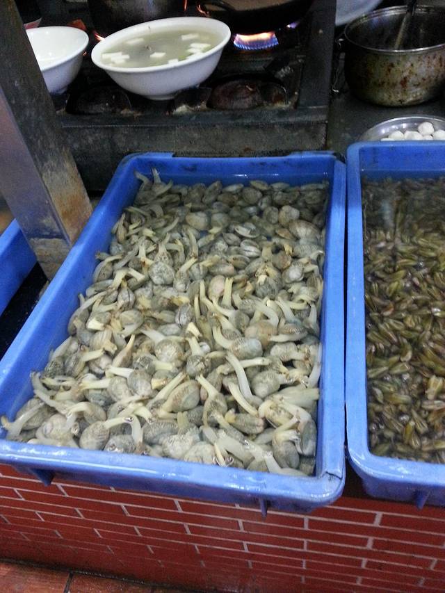 我也不知道下图中那个长得象蜗牛一样的东西叫什么名字,只是感觉他们好鲜活,biubiubiu的一个劲儿的往外喷水:)在这里吃饭有点点麻烦的是我们需要在每个档口看好自己要点的东西,记住档口编号以及金额,然后去收银台告诉收银员你记下来的档口号以及金额,各个档口分开付款。