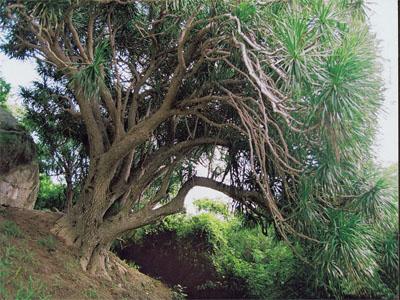 南山不老松,学名:龙血树,属龙舌兰科,常绿植物,其树脂可入药,有止血、养气、生肌等功效。白垩纪恐龙时代即已出现,被称为植物中的活化石,世界科教文组织列为保护树种。我国亦定其为珍稀濒危植物,属国家二级重点保护树种,主要分布于热带、亚热带地区。目前,此树种已濒临灭绝,但在三亚市南山一带却生长着三万株之多,主要集中于大小洞天旅游区,树龄愈千年的有两千多株,最长的有六千年以上。