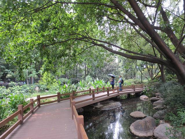 园内林木葱郁,翠竹摇空,湖溪环绕,环境幽静。