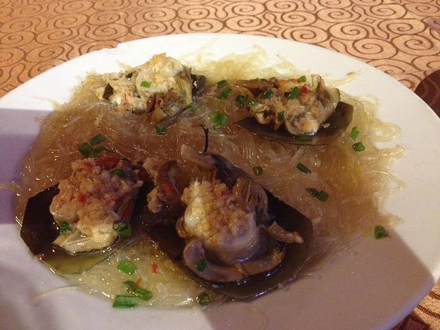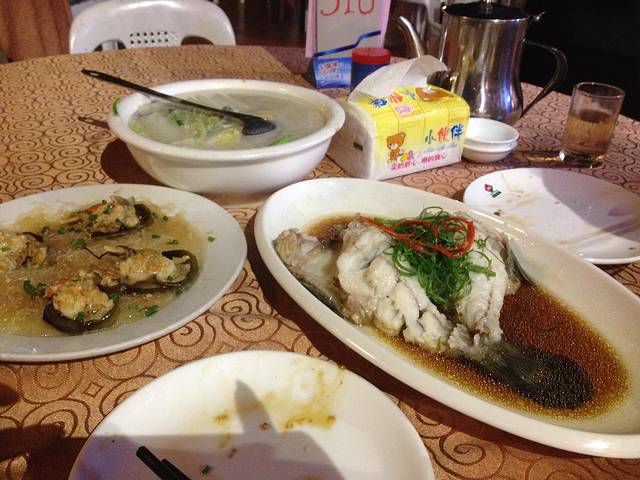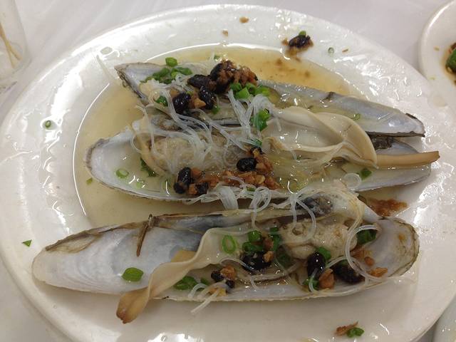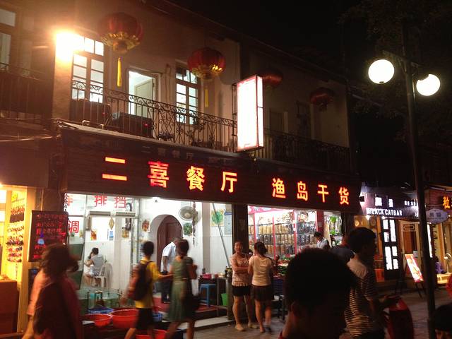 6号晚上,吸取经验不在小店吃,来到一家名叫二喜的餐厅,门口放了好多水箱,里面都是看的到的鲜活海鲜,点了海瓜子和回锅肉,还有180元一斤的玉米棒。海瓜子先上桌,一吃又是臭的,拿下去了。2个玉米棒做好了就是这样子的,亲们这像是一个有半斤重吗?又是传说中的五、六两秤?!后来去吃了沈家肠粉,味道一般但一定是岛上最实惠的食品之一,9元。随便挑了一家扁食吃15元,感觉味道很一般。