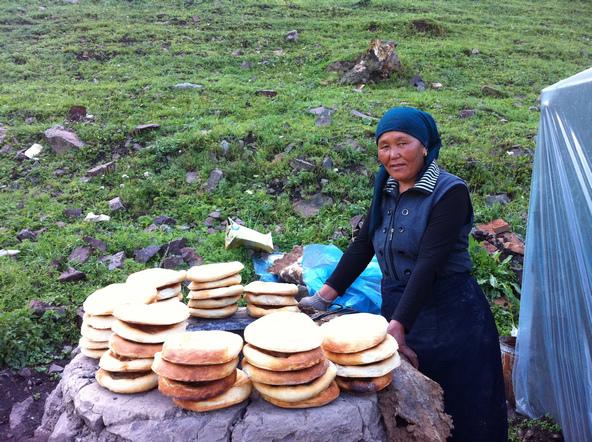 天山河谷哈萨克农家乐做馕饼的大妈。