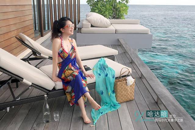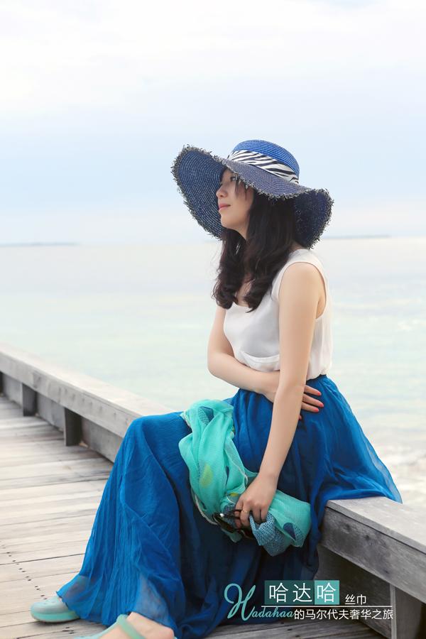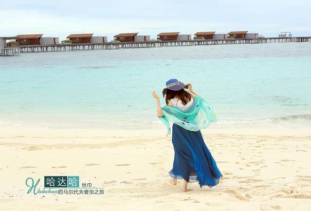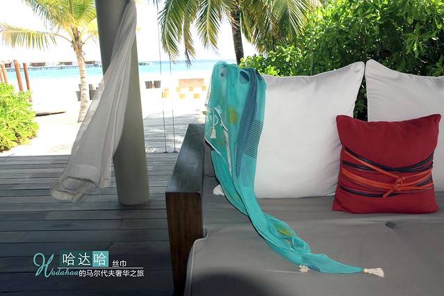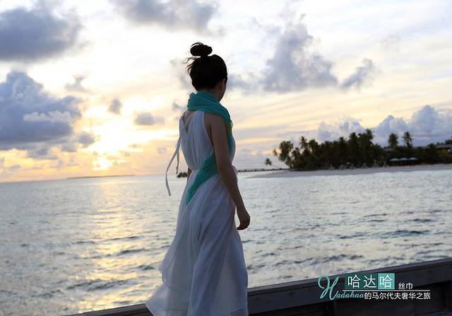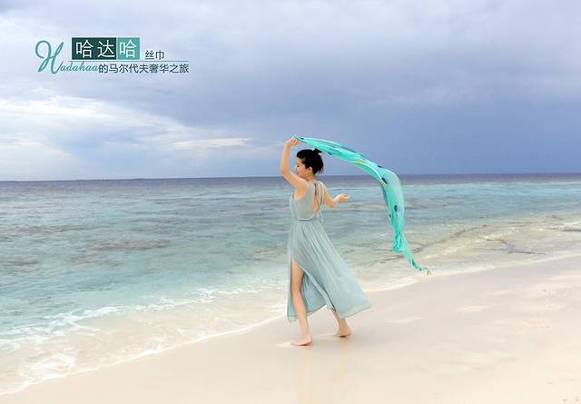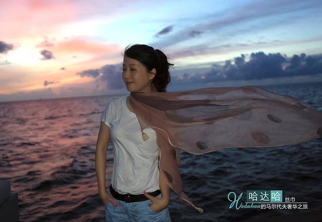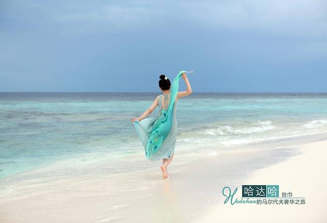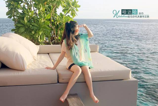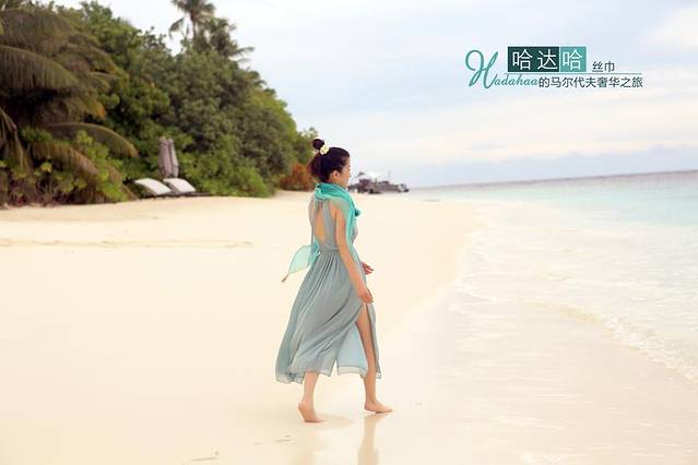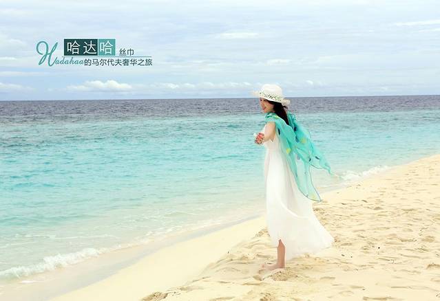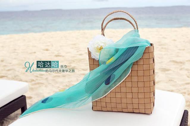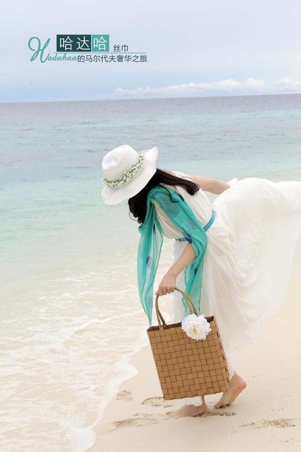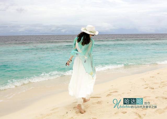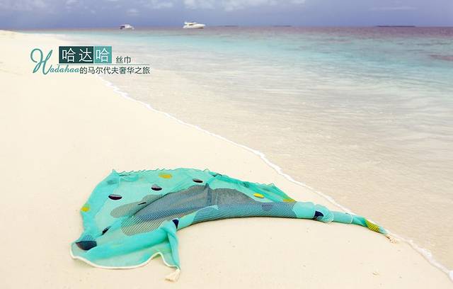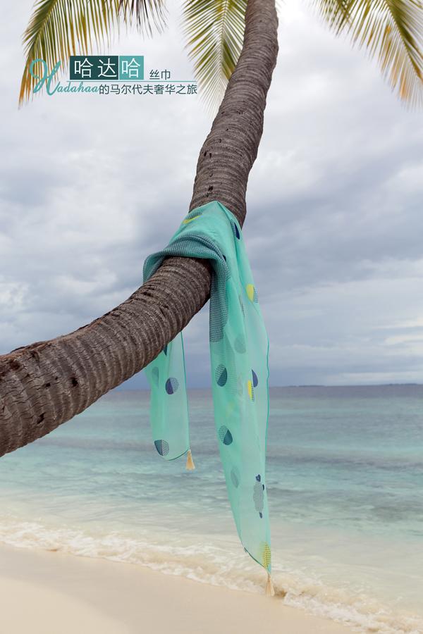 你看,是上帝用画碧海蓝天剩下的颜料画了这条丝巾。那是整个马尔代夫的深海蓝和浅海绿,女巫将针织蕾丝踏成一道细致的滚边,那是HADAHAA岛屿洁白蜿蜒的海岸线。这一条丝巾啊,让你忘却世界的其他颜色;这一片海啊,让你联想不起任何一片海;就比如一个姑娘,让你想不起她之前的任何一个姑娘。
