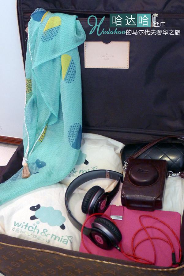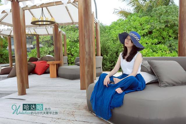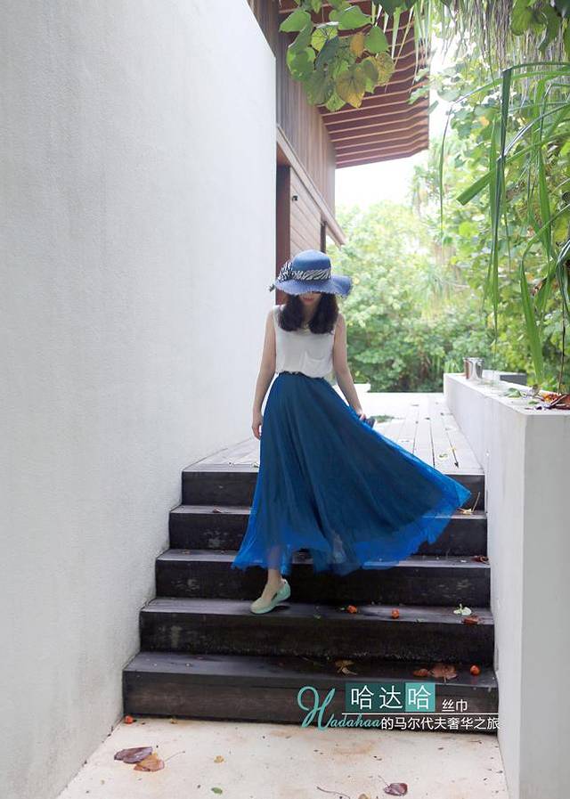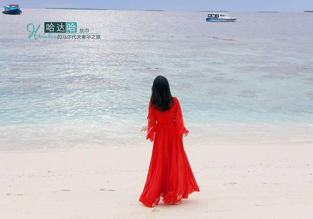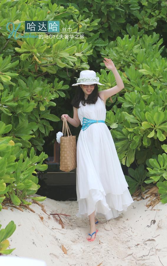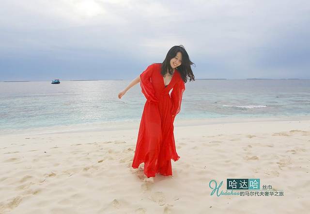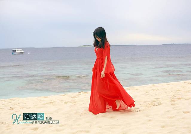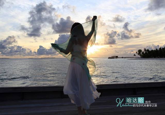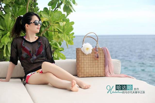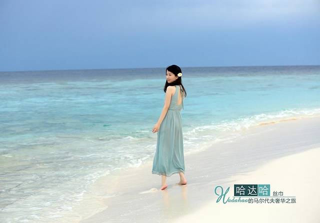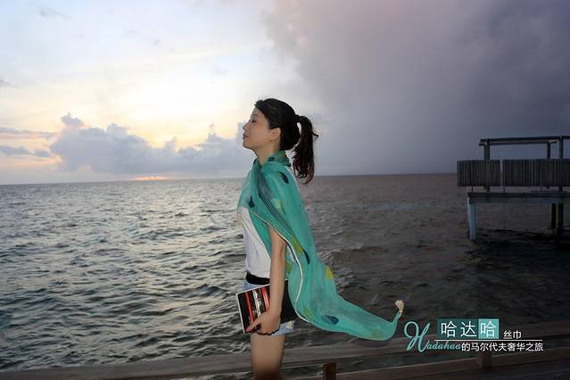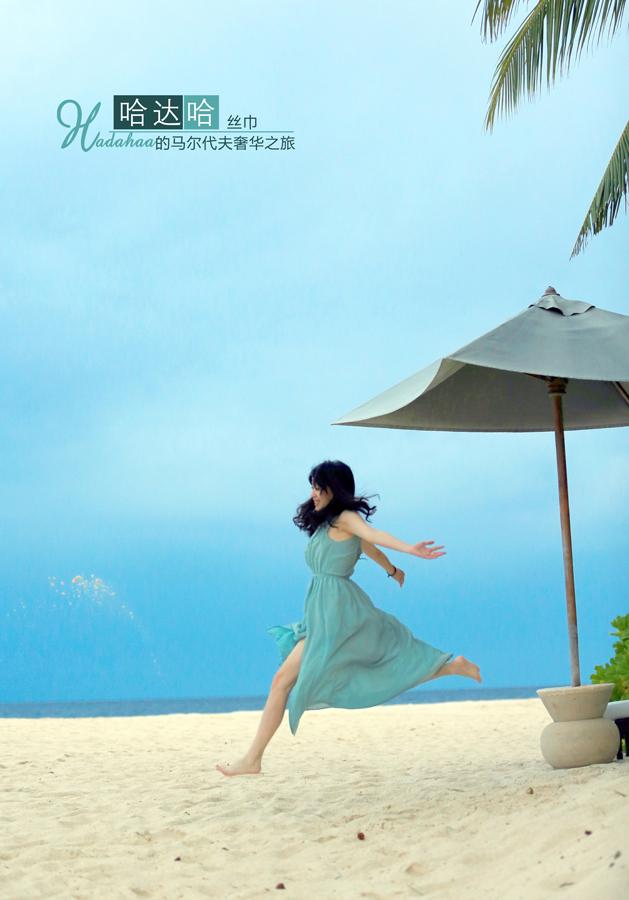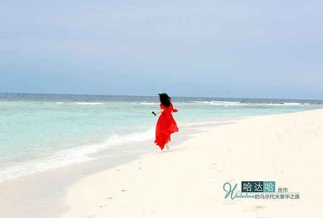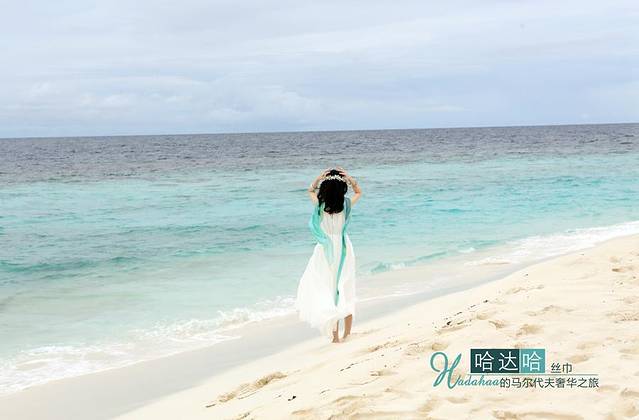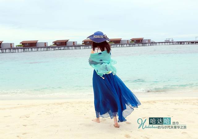你看,是上帝用画碧海蓝天剩下的颜料画了这条丝巾。那是整个马尔代夫的深海蓝和浅海绿,女巫将针织蕾丝踏成一道细致的滚边,那是HADAHAA岛屿洁白蜿蜒的海岸线。这一条丝巾啊,让你忘却世界的其他颜色;这一片海啊,让你联想不起任何一片海;就比如一个姑娘,让你想不起她之前的任何一个姑娘。