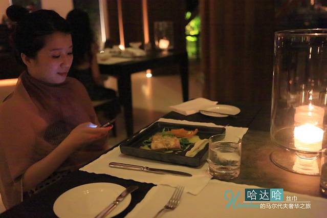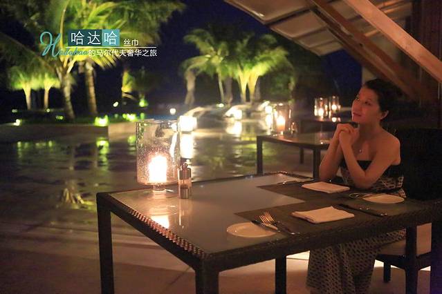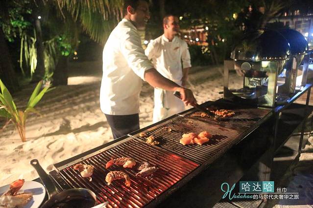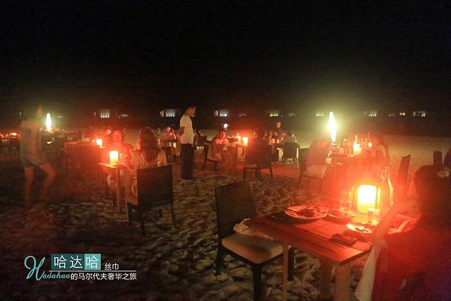 当大海把夜晚推上岸,今晚就让我们去沙滩上享用龙虾盛宴吧。当然,得额外每人再支付70美金。炭烤后的当地龙虾身材短小精干,浑身散发着让人无法抗拒的闪亮深红色。一口咬下它雪白的肉,满嘴是鲜甜的海洋味道。自助餐的食材都很简单,只是胜在新鲜,胜在你是脚踏在柔软的沙滩上,印度洋的从容海风正吹拂过你们轻声交谈的片言只语。那位穿白色上衣站立着的小伙子就是我们的管家benny,每天当我们出现在餐厅时,他都会来轻声问候,他的声音很低,音调拖得很长:今-天-过-得-好-吗-。然后他说,明天上午10点帮我们安排好了spa。他说的实在是太慢了,慢得让女巫忍不住打断了他:好-的-啊-明-天-见-