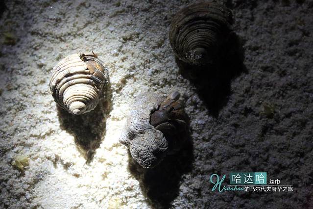 哈达哈岛环岛一周大概是20分钟。晚餐后,我们从沙滩慢慢绕回房间,结果边走边玩了1个小时。打开小电筒,夜晚沙滩是小螃蟹的天地。它们三五成群,横着从海里一闪而过跑到某个洞穴里,又或者百无聊赖的从沙滩左面走到右面,然后再走回来。只有眼明手快的高手才能几个手指就搞定了它,佯装高举起来,看它惊慌的乱蹬脚,然后再轻放下它,它一溜烟就躲角落里去了,估计今晚再不会出门溜达。我们还拍到几只正在开会的寄居蟹。它们看到光,就赶紧缩了头脚,天真的以为我们彼此都看不见了。