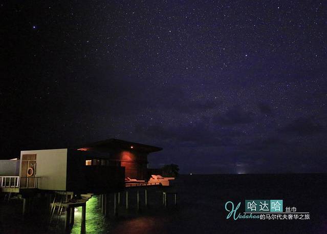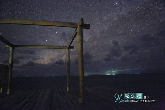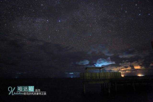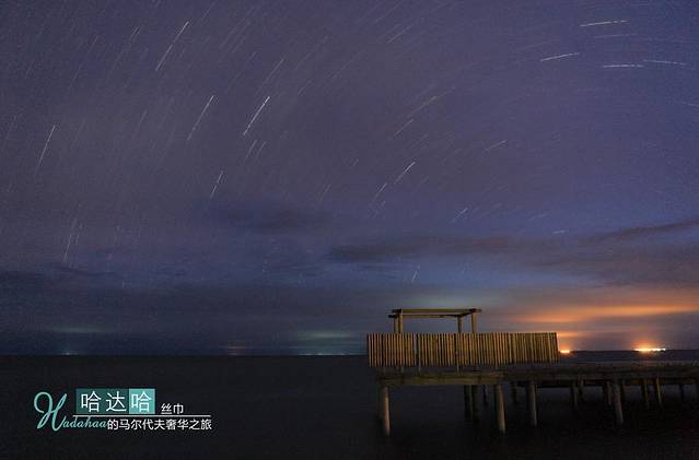 夜深了,听着海涛,谁都舍不得睡。抬头仰望,密密麻麻的星星,正悬挂在赤道上方瓦蓝色的深邃天空。摄影大叔用三脚架支起相机,先到对面的栈桥上,用高感光度、5秒的速度定格了星空下的水屋,一颗流星正出期不意地突然滑过。掉转镜头,发现栈桥上方竟然有一条银河明晃晃地横亘空中。最后折回露台,架好相机,对准天空,缩小光圈、降低感光度、打开B门,用快门线锁住快门,曝光两三个小时,记录下今晚星空的心路历程。