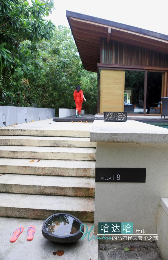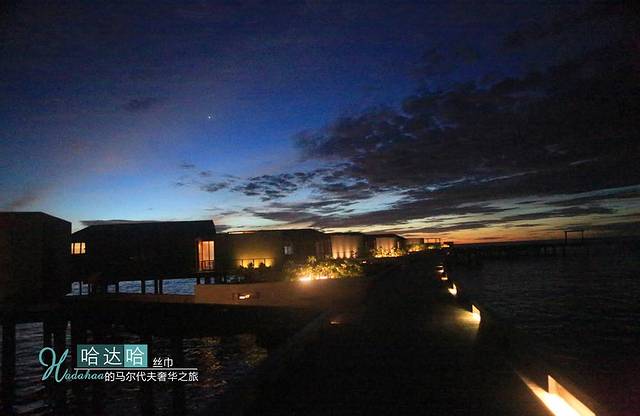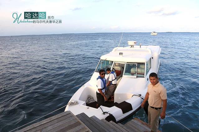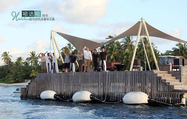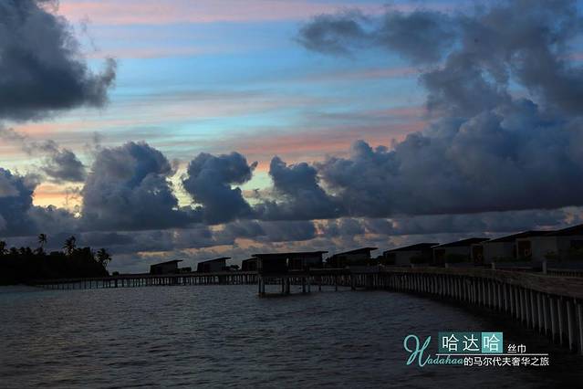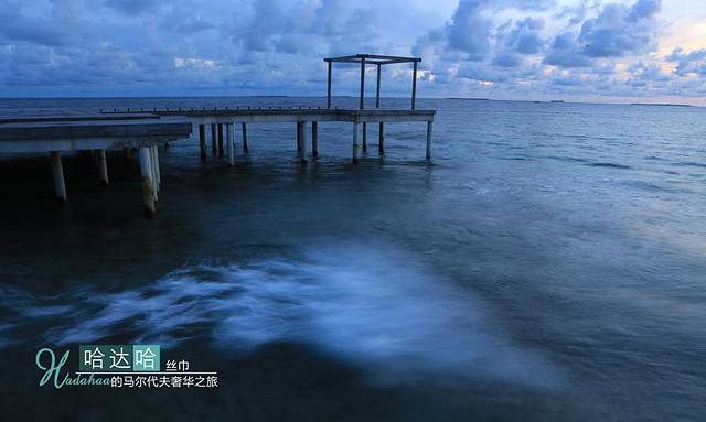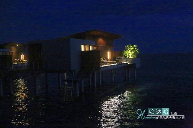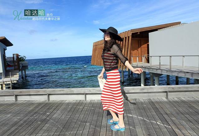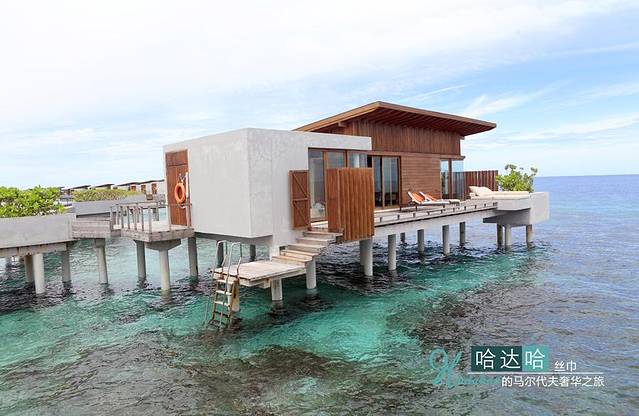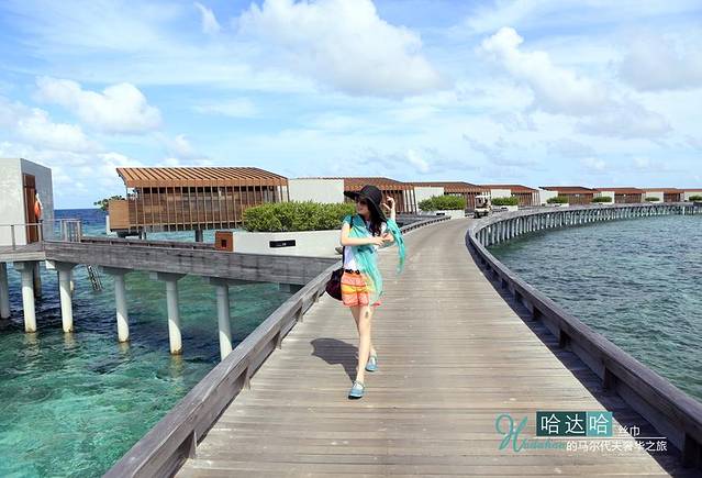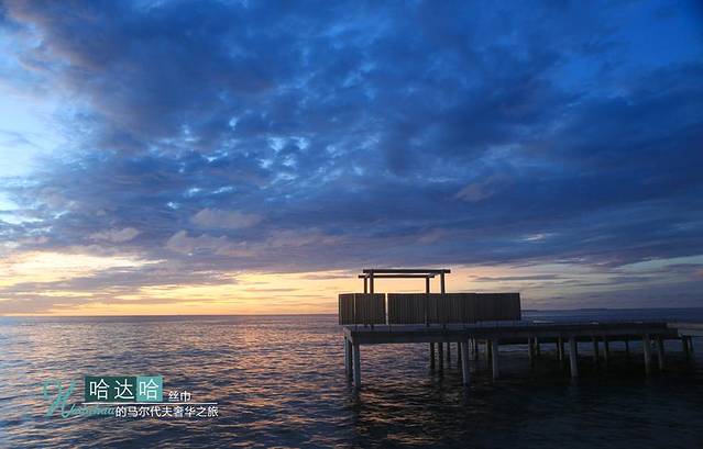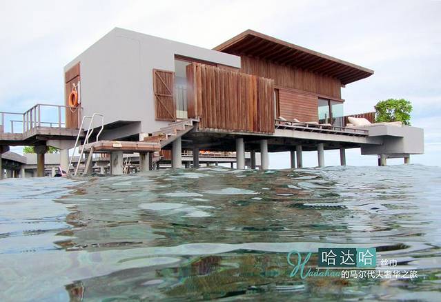 就算知道有更好的在等着,还是回头再次依依不舍的告别沙屋。坐上小黑的电瓶车,我们开往海上栈道。之前在攻略里看到,43号之后的水屋都是浮潜圣地,大s来这岛上过生日时住的是46号。所以女巫在心里暗暗祈祷,电瓶车啊,请你开得远一点,再远一点吧。我们在突然放晴的太阳下开到了40号。。43号。。46号。。48号。。电瓶车还是没有停下来的意思,它继续往天边开过去,开过去。。。一直开到栈桥的尽头!第51号!第51号!女巫超级幸运的得到一间HADAHAA岛最完美最远离岛屿的水屋。