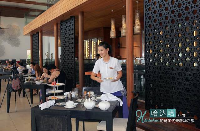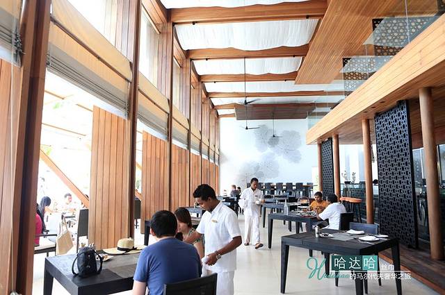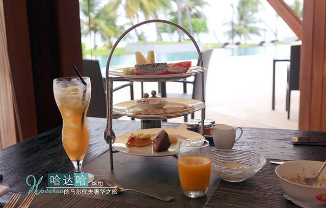 沉沉入睡的甜夜。醒来是马尔代夫7月雨季的阴雨天。早上10点,我们从雨林小道走去餐厅早餐。林间偶尔几只硕大的蝙蝠朗朗飞过,就连岛上的蝙蝠也已完全剥离了阴郁外表。餐厅是一个非常通透的挑高木建筑,正对着美丽修长的泳池和辽阔印度洋。这是我们进行了一半的早餐,好喝的橙汁令女巫一连喝了好多天都不曾变心。菜单上有各种好吃的名字,据说集合了全球凯悦酒店连锁的美食。想吃什么,任点。