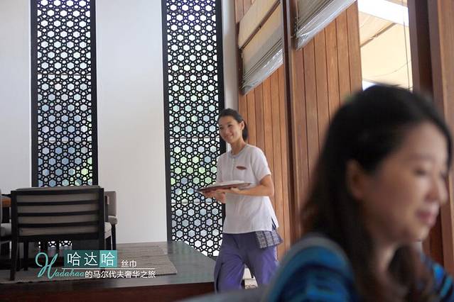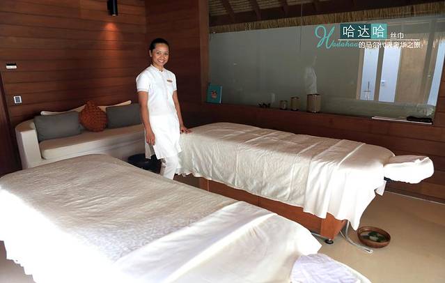 管家benny已经在等候我们了。一看到他,我就抢先回答:我-们-过-得-很-好-。他依旧用很低的声音笑,然后用慢动作带领我们走去spa中心。我问他:你是在禅修吗?他回答:禅-修-?没-有-吧-。曲径通幽,在一个被美丽鲜花蚕食的隐秘游泳池后面,就是著名的哈达哈spa按摩房了。照片上这位黑黝黝的漂亮姑娘就是我的理疗师,接下来,她为女巫献上了舒服极了的已经不愿再陷入惆怅甜美回忆的60分钟。