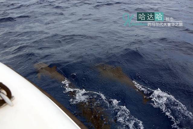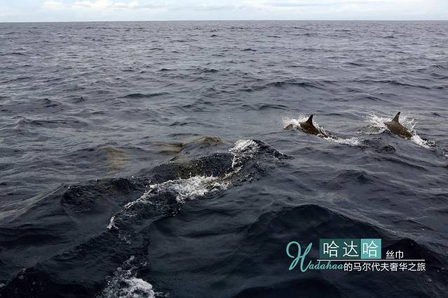 白色的酒店专属快艇小巧雅致,座位柔软可靠。小黑同学边送上冰毛巾和救生衣,边已敏捷发动马达,一个身材高大的小黑始终站立在快艇的右侧后方用身体来平衡飞速的颠簸船身,我们即刻从碧蓝海面上发射向远方。几分钟后,驾驶员小黑高声招呼快看快看,他也不说看什么,向着他指向的海面仔细看一会儿,突然整船爆发欢呼:是海豚!没错,我们多么神奇的一离开陆地就看到了幸运的海豚。它们像孩子般嬉闹追逐在船的一侧,发出轻微的鸣叫,有几只还顽皮的起跳去了船头位置,仿佛好客的主人引领着天外来客快点去到它们的海洋仙境。