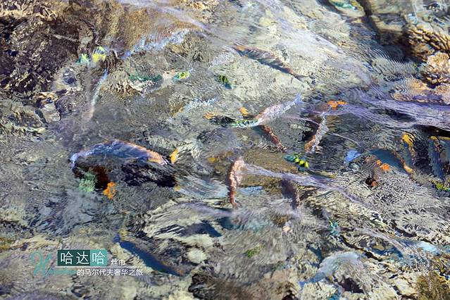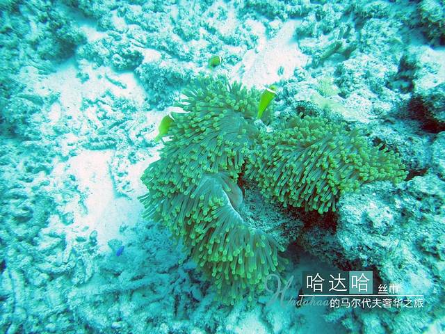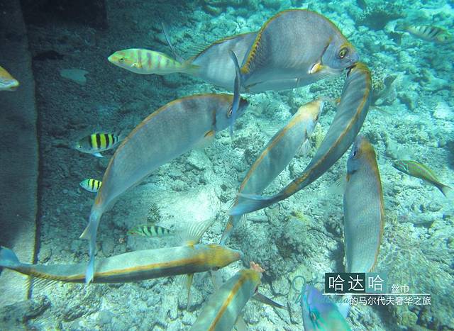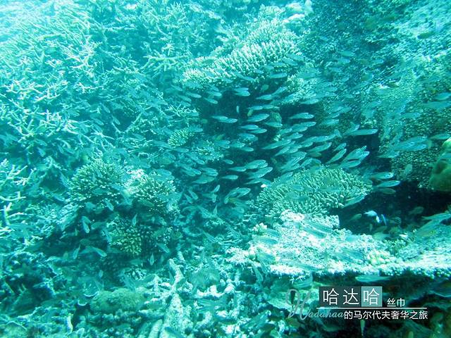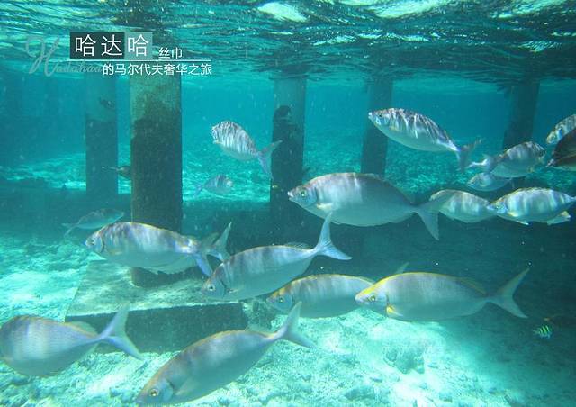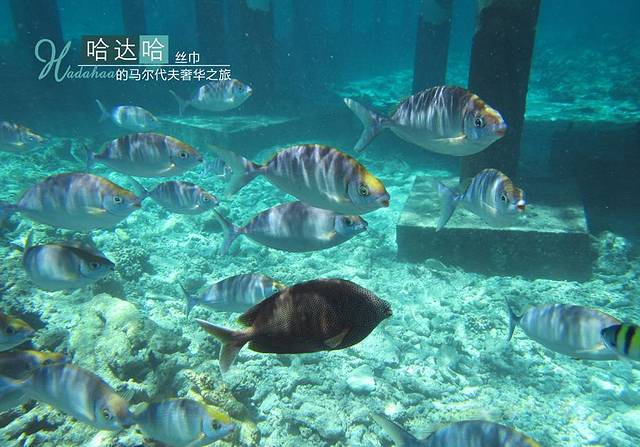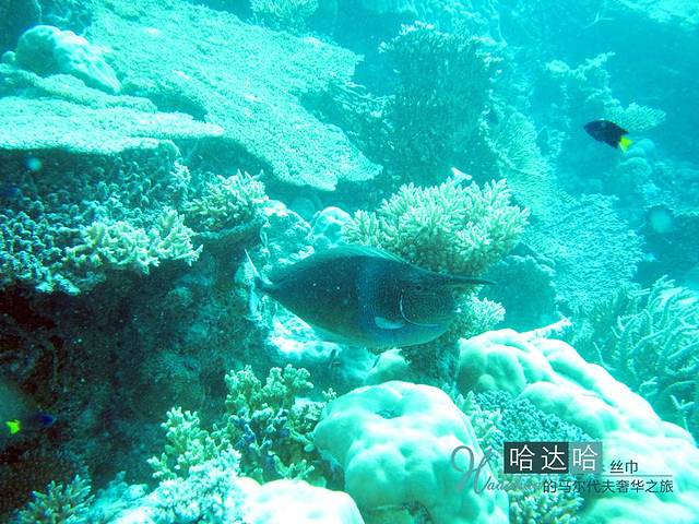 请马尔代夫原谅我。自始至终,不会游泳天生怕水的女巫紧紧拽着51号水屋下的扶梯铁栏杆,把头深深埋在水里,却死死不曾松过手。其实这不妨碍我看风景,虽然我不游动,鱼还是在游来游去啊。温度适中的印度海底到处都是硕大珊瑚,我看到各种曼妙身材的热带鱼,它们身上携带着太奇妙的漂亮色彩,那么纯净,那么深邃,陆地上绝无仅有。好几次,女巫忍不住要惊呼出声,又担心呼吸管进水,只好克制着在水下发出一串呼噜噜的怪声。好吧,贴几张摄影大叔的水下处女作,代表我的看见。那些鱼身边的柱子就是我们51号水屋的地基噢。