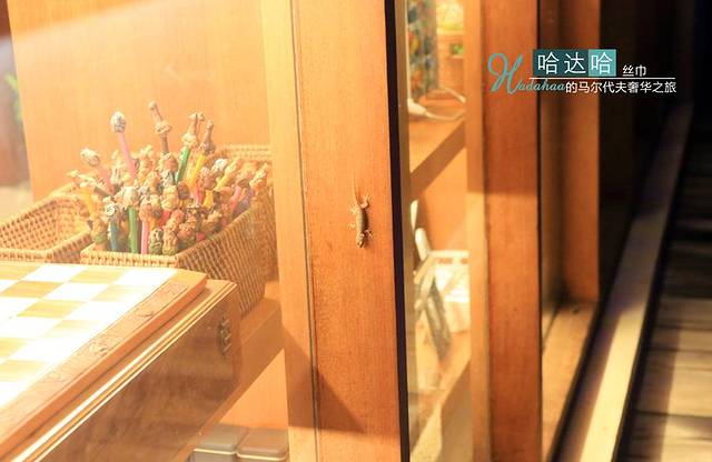 餐后在酒店中心区域四处逛逛,酒会散场的接待厅格外寥落迷人。在阅览室,看到很多本游客留下的英文版图书,只有一本是中文的啊。一群新加坡的小孩在玩电脑游戏,一只壁虎正悄悄路过商店。