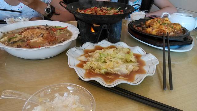 12点结束通天岩行程,坐18号返回南门口,直奔“怪味大排挡”,点了四个菜,每个菜都令我们赞口不绝,其中干锅鸭掌是我们的最爱,鸭掌柔若无骨,爽口微辣。当时我们为了吃到原汁原味的怪味风味,只要求服务员“手撕包菜”不加包辣,让女儿只吃青菜,其它菜都保留店家原有的味道。