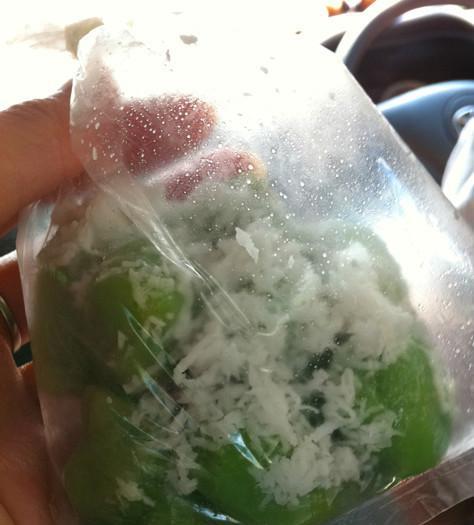 和他沟通半天,这个绿色小团子是用一种米之类的东西蒸的。里面是甜甜的ms巧克力酱