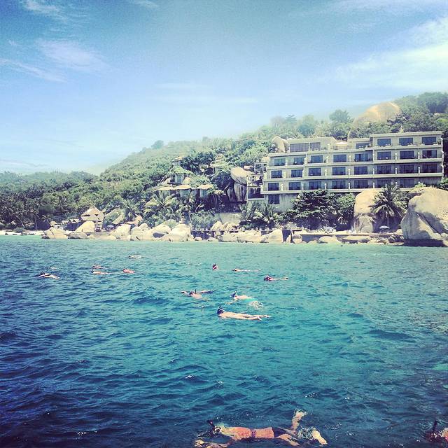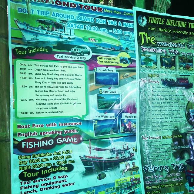 酒店可以帮忙预定浮潜一日游,定的diamond tour,去了shark bay,awo leuk sandy bay,hin wong bay,koh nang yuan,有专车来酒店接送,浮潜工具有免费借的,建议可以带自己的面罩卫生点,还有潜水袜也建议带着!船长是个很有意思的外国人,还会让大家自我介绍并且组织大家为当天生日的乘客唱生日歌~气氛非常好~每次下去浮潜上来,都会免费供应一种水果给大家解馋,水和饼干也都是免费的,饮料是要另付费的,价格也是比较公道的