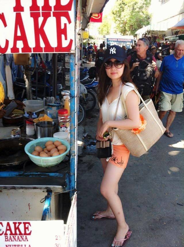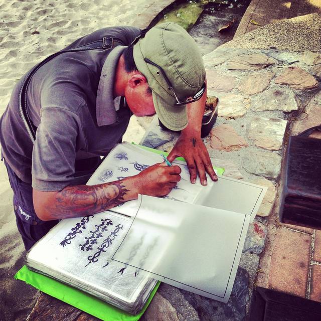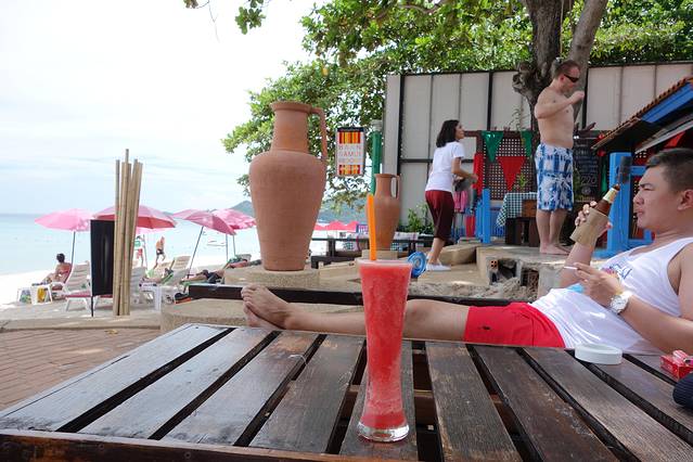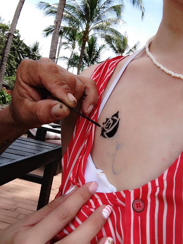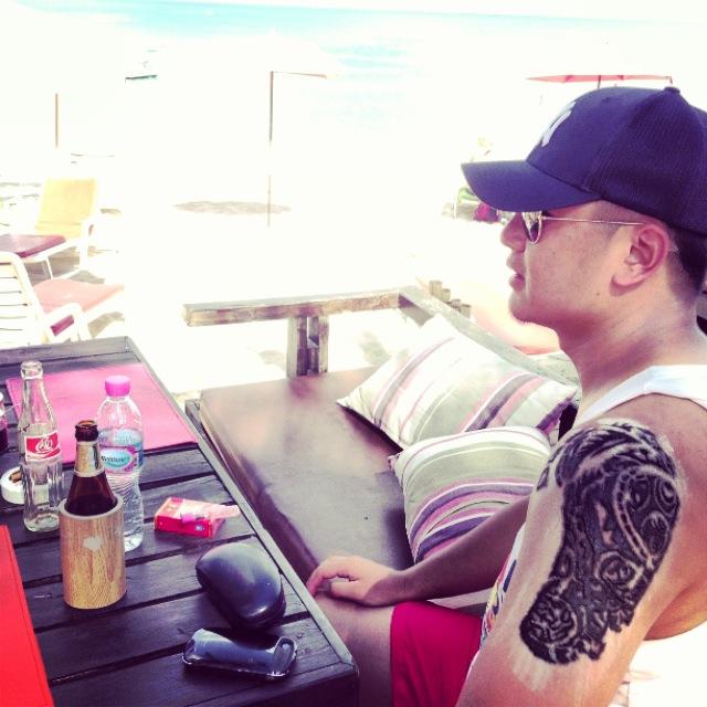 胖子这几天看外国人都有纹身,吵着要弄,回酒店沙滩午餐的时候看到有小贩画临时的,可以保持2周不褪,于是小过下tatto瘾,2人花费2100株