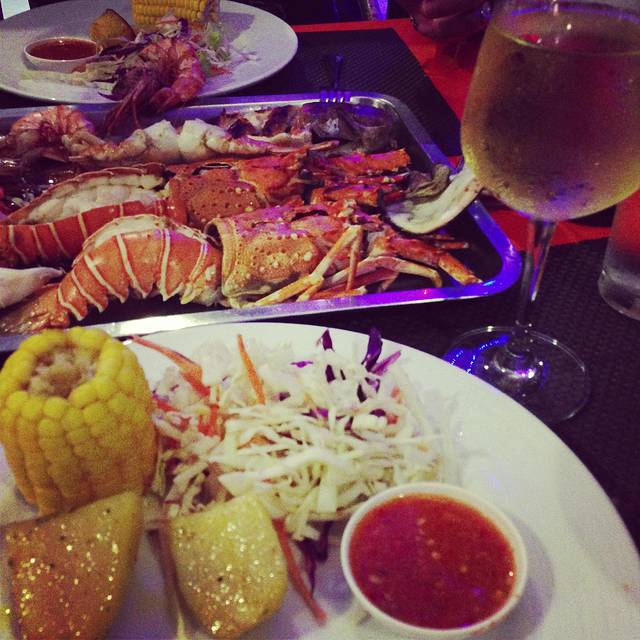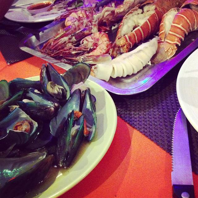 街上有好多餐厅,看上去不过都差不多,海鲜BBQ为主,去人多生意好的店总没错,随意的选了一家,点了海鲜BBQ套餐(1700泰铢,包括2只大龙虾,4只小虾,鱿鱼、青口贝、生蚝等),味道比较清淡,沾泰式酱料