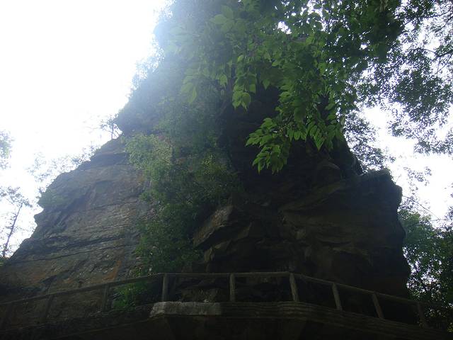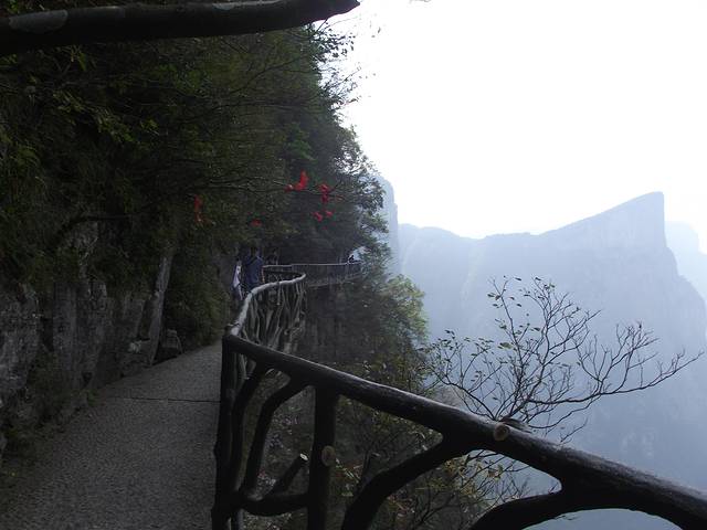 从一步登天下来,从小卖部的右边下山,下到平台,有一块指示牌。记住:千万不要在往下走了,哪里标明灵石咬树,但实际没什么看的。从右边沿着山壁向上爬大约10分钟就到了空中走廊。