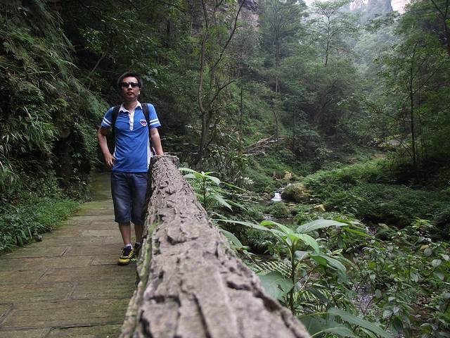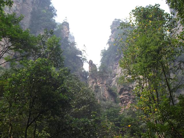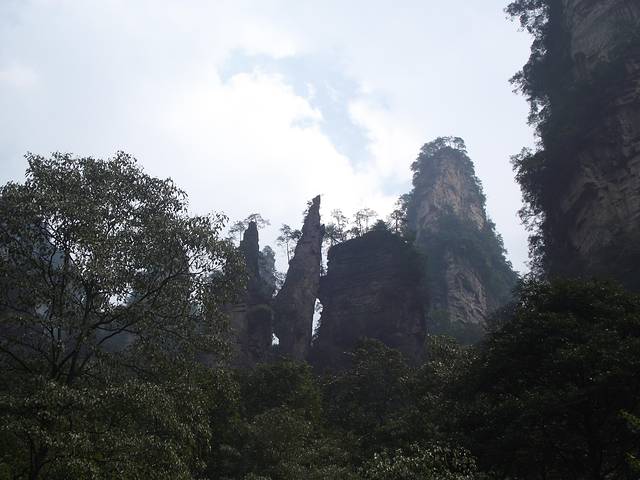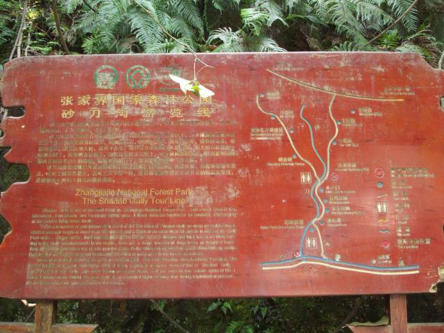 在紫草潭对面洗手间傍边有一条小路。那就是通向砂刀沟的。我原本的计划是从砂刀沟步行上山,因为担心步行的时间过长,上去看过袁家界景点以后赶不到最后一班环保车,所以走了一段后放弃了。这路人迹罕至,十分的幽静。上去以后一样可以看到袁家界的迷魂台、乾坤柱、天下第一桥等景点,出口在天桥车站和乌龙寨之间。现在想起来十分后悔,其实应该走这条路。建议有去的朋友一定走这条路。因为乱窜坡上袁家界没什么风景,而且最后那段十分陡峭,也很耗体力。
