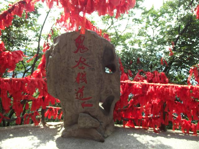 心情愉快,7千多米的索道很快就到了。现在要选择行走的路线了。我选择了西线。具体路线如下:西线(觅仙奇境景区):大索道上站→凌宵台(登仙台开始觅仙之旅)→倚虹关→鬼谷天堑→鬼谷兵盘(与孙膑庞涓共师学法)→野拂藏宝(探询李自成财宝掩埋之迷)→小天门→捭阖(天地阴阳,纵横捭阖)→观鬼谷洞(遥望山壁悬门,感受鬼谷仙魂)→求儿洞(掷石入洞,一声为子,两声为女)→樱桃湾(体验仙山灵餐)。