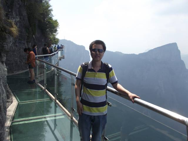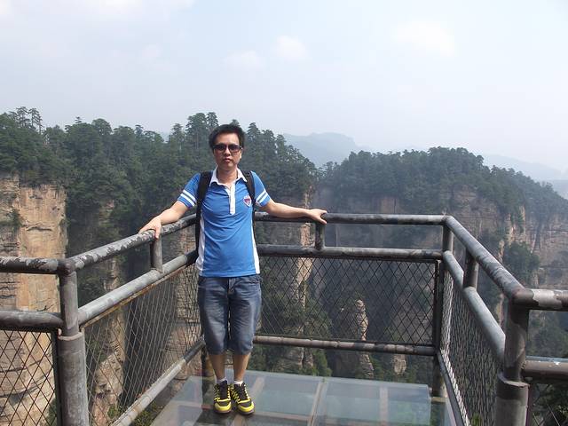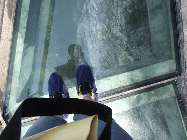 往前走,就是玻璃栈道了。有一女的,在哪里收钱,10元一个,说是为了保护玻璃的通透性。鬼,我看见有人根本没套也直接上去了。进去一转弯,就听见有尖叫声了。走上去,刚开始还有点胆战心惊,不敢下视,看着外面的蓝天白云和茫茫云海,胆子也大了起来,勇敢的往前走吧。可是,还没过瘾,栈道就完了,原来只有60米。好吧,脱下鞋套,继续前行。对了,千万记得,拿票跟放鞋套处的工作人员换回5元钱,票上有注明,但一般人都不会去看。我也没有换,真坑人。