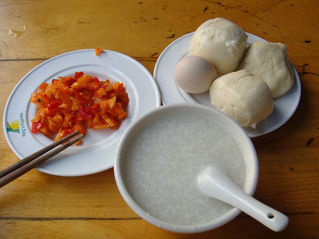 八戒的早餐可以在昨晚预定,预定便宜2块,只要8元。是三个馒头(别想太大,小小的),一个鸡蛋,萝卜干一碟,粥随便喝。好吧,多喝点粥,留一个鸡蛋馒头当路途的补充,哈哈!是不是很抠啊?