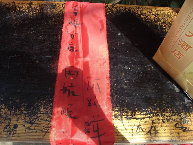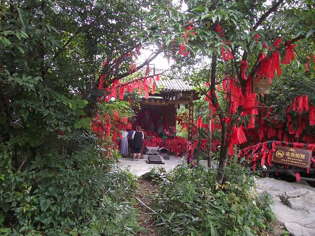 走出玻璃栈道,迎面而来的是挂满树的红绸。花2元钱买一条,写上自己的心愿,将它挂在树的上面(据说挂得越高越结实越好),愿上苍保佑吧。