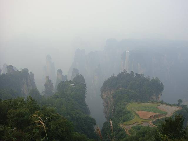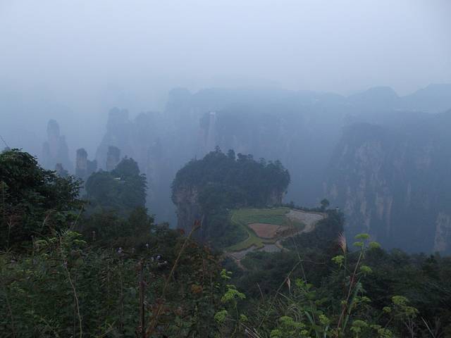 时间过了6点半,司机招呼大家上车继续前行,大约7-8分钟,就到了网上很著名的空中田园了。说明一下:现在的空中田园已经不是网上图片的那个样子了。村民有钱了,挖掉了许多田,只剩一块心形的田了。但景色依然漂亮,早晨的空气清新,有小鸟欢快的鸣叫,田园像一颗爱心,在若有若无的雾气里显得分外漂亮,背景是雄伟的百龙天梯,好一副美丽的图画。