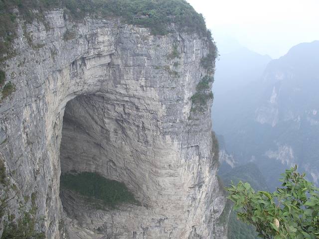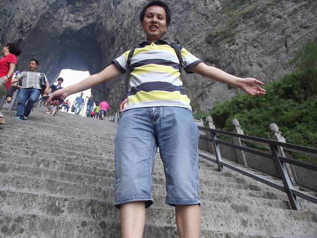 站在天门洞下,清风徐徐吹来,远处是蓝天白云,多么美丽啊!努力向上伸展双臂,仿佛可以触摸到天,啊,大身的欢叫,将生活中的一切不快都统统抛弃。逗留半个小时后怀着依依不舍的心情,走下天梯,这下可领教了什么叫“上山容易下山难”的含义了,两个腿不停的打颤,只好扶着铁栏杆一步一步的挪下去。