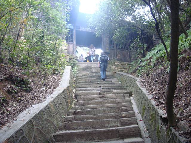 在去一步登天的路上,有一个三岔口一定要记住。就是遇到的第一个小卖部(但是已经没有人在卖东西了),小卖部的对面有一条小路,开始有几级石板路,再下去就是泥巴路。这条就是回乌龙寨停车场的近路了,看完空中走廊回来从这里去停车场至少节约半个小时的路程,所以一定要记住。